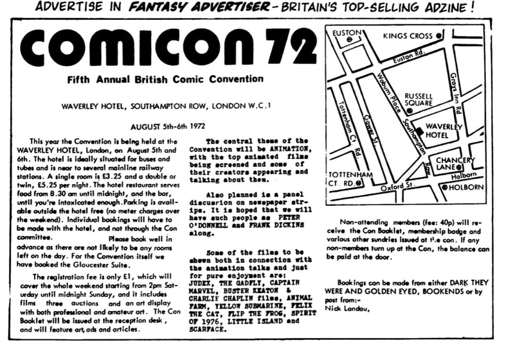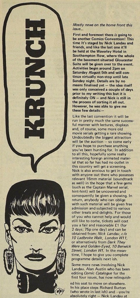 Several weeks later, in the Think Off column in July 1972’s Comic Catalog #6, the seemingly tireless and determined Nick Landau wrote that, at the time of writing, there had already been “over a hundred registrations” for the coming convention. Things were evidently moving fast for Landau, to his credit, given that he had never organised a Comicon before.