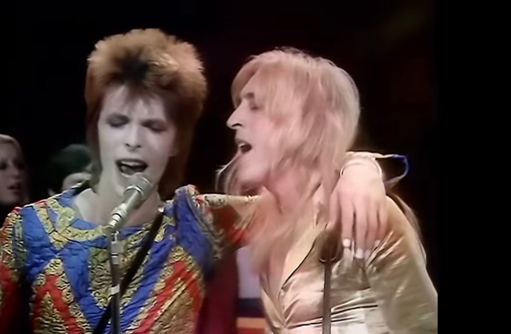 So even in the context of this single show, Bowie and his band stood out dramatically. There was nothing else to compare in any way with Starman’s joyfull sci-fi messianism. There was certainly nobody to match his and The Spiders’ dedication to full-on Glamsterism. And there wasn’t anything within a solar system or three that matchedb Bowie’s deliberate if playful challenge to heteronormativity. None of that would’ve counted for much if the song wasn’t so strong, so enjoyable, but the whole package was as eye-catching as it was enjoyable/infuriating. It didn’t immediately catapult Bowie to the higher reaches of the chart. In seven days, Starman had risen to #20. In another week, it was at #18. But something far more important than chart placings had been transmitted here: a startling, charismatic identity that was well worth paying close attention to.