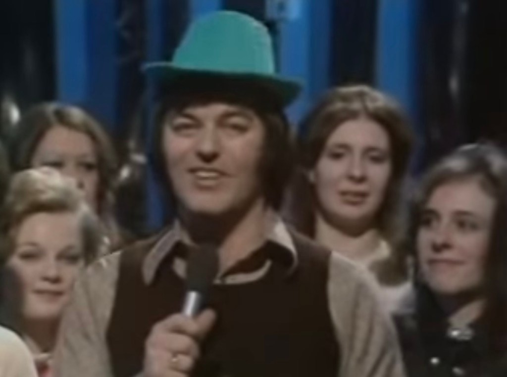 Presenter Tony Blackburn, who seems an awful lot more palatable today than he did back in the day, with a green felt hat, which might just have been the closest he ever got on TV to Going Full Glam.