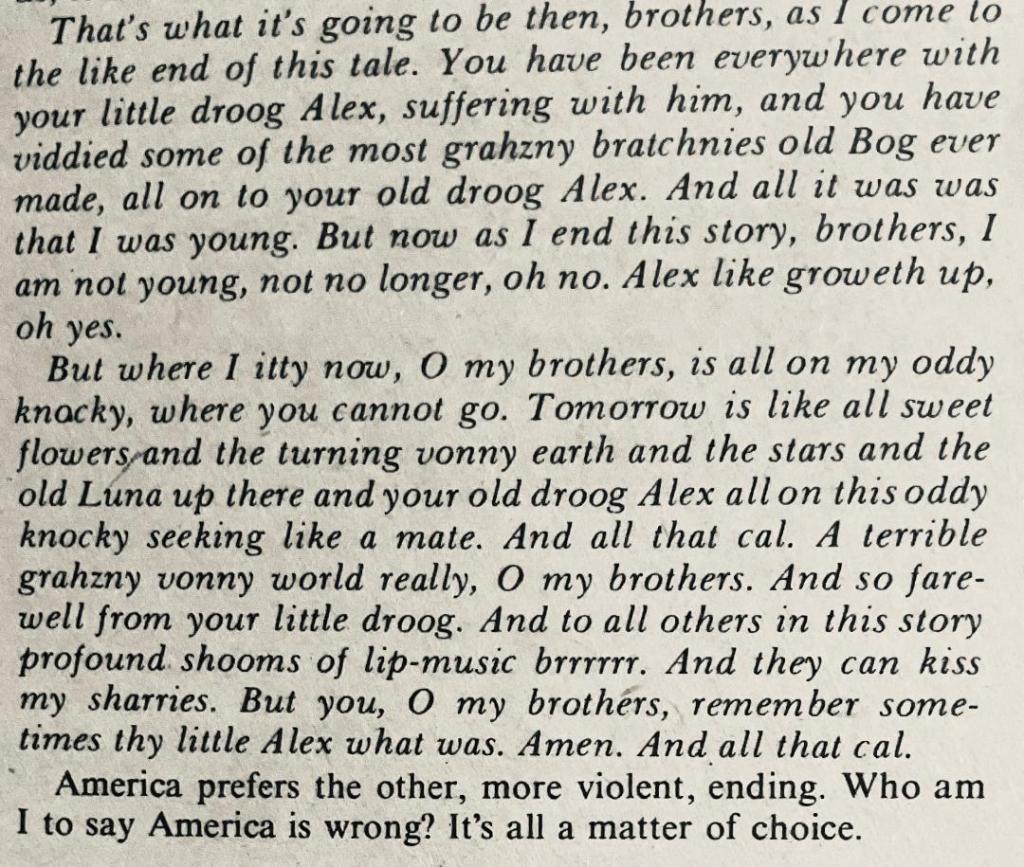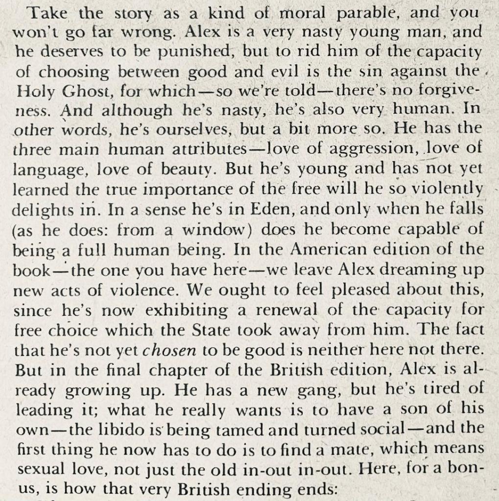 Most interestingly, Burgess finishes off by trying to guide the reader’s understanding of A Clockwork Orange in its written and screen forms, while paying particular heed to the fact that the British and American versions of the novel end in very different ways.