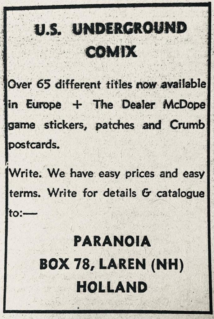 Finally, an ad for an Underground Comix mail-order service in Holland. For those willing to take a chance with overseas box numbers, the complete absence of regulatory oversight, and the fervor of British customs officials when faced with supposedly corrupting periodicals and merchandise, it would have been a welcome chance to order titles and the like which went largely unseen in the UK.