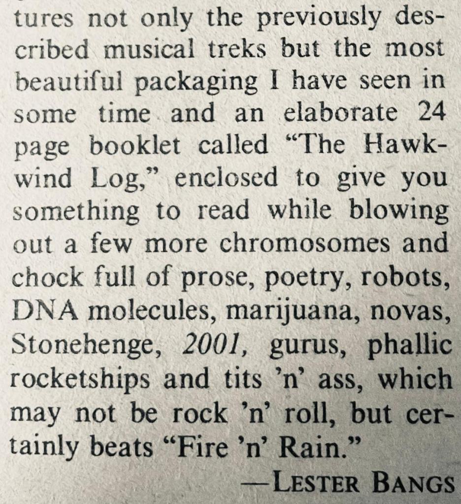 From where I’m sitting as I’m typing this, I think Bangs lacked an understanding of the genre, musical and social contexts that helped make Hawkwind so exciting and so vital in the period. But as a prime example of his own (considerable) strengths and weaknesses, Bangs’ review of In Search Of Space is just about perfect.