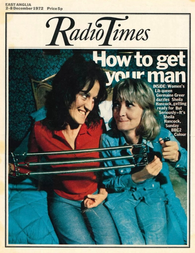Germaine Greer was already a familiar figure to many when The Female Eunuch first appeared, and her fame in the period can be partially gauged by her appearance on the cover of December 2nd 1972’s Radio Times below. When Cooper portrayed her as an absurd icon of an uber-separatist future state, he was engaging less in a broad historical debate and more in a specifically contemporary battle of ideas. She, or the very least the use that her thought might be put to, was both silly and dangerous.