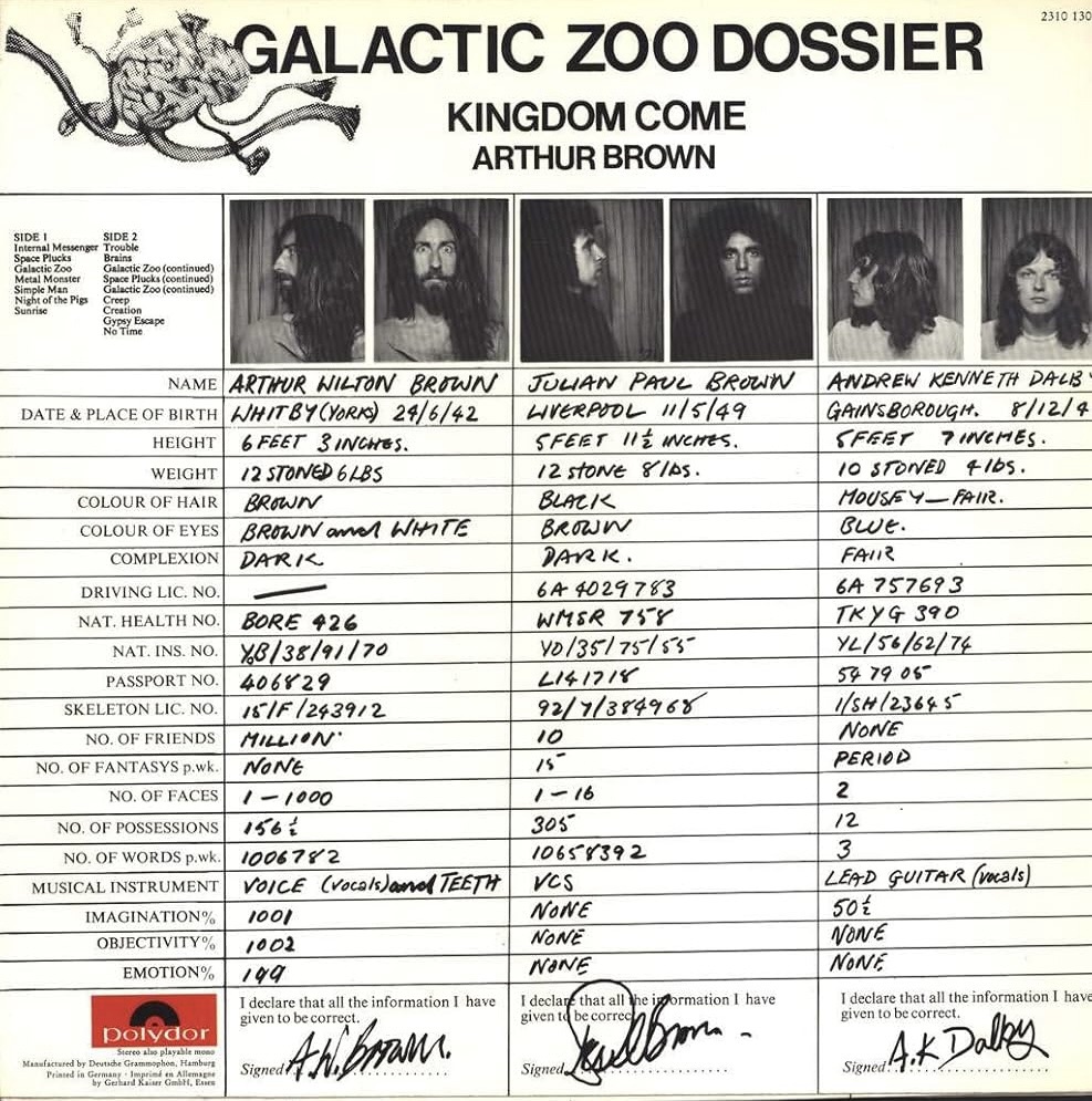 Apparently support band Swastika, with their name illustrating a pyrrhic triumph of idealism over common sense & decency, failed to turn up, so Mr Brown and his colleagues played an extra-long progressive set which included the singer setting light, as tradition now demanded, to his own precariously helmeted head during Fire. As you can see from the track list of 1971’s Galactic Zoo Dossier LP above, the fantastical was absolutely central to band’s work.