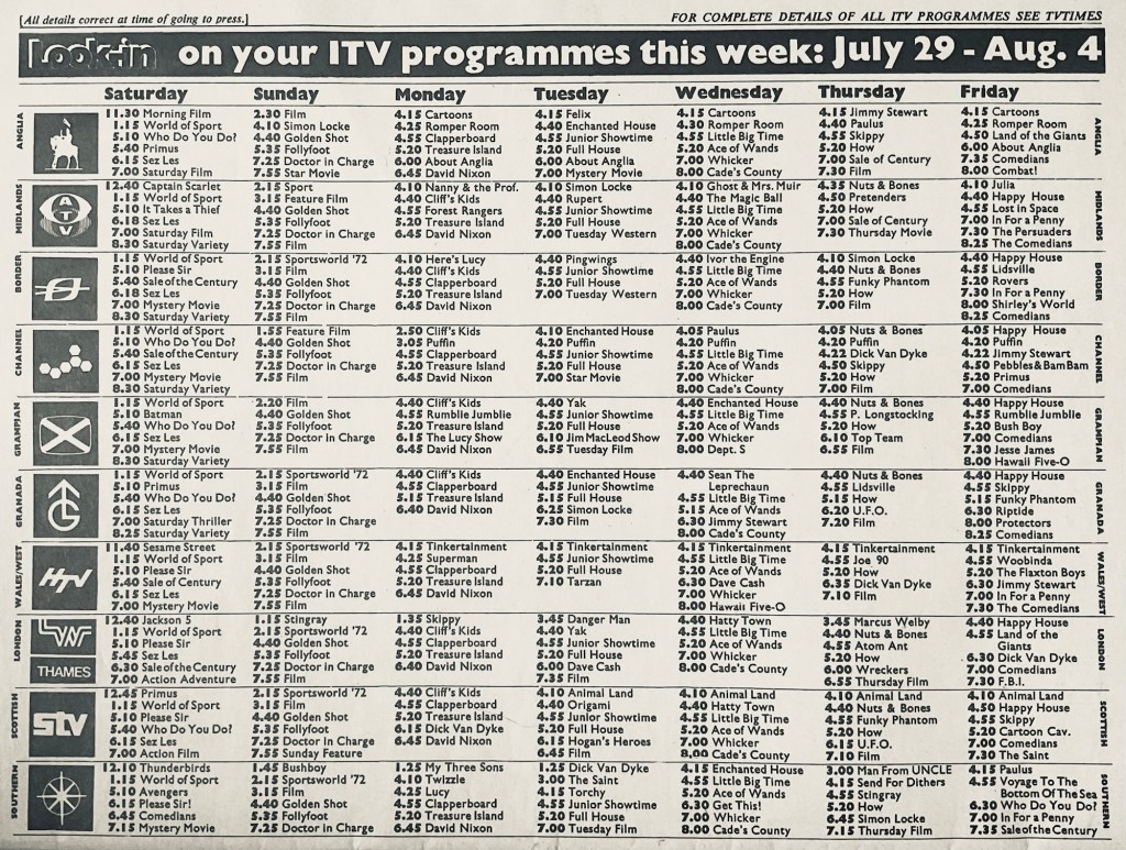 But for our purposes, the TV listings at the back of Look-In tell a truth about how varied and at times flat-out confusing the 14 different ITV schedules could be. Since this is this blog’s entry for August 1st, we might take a glance at the Tuesday column below for this date in 1972, where it can be seen how fantastical-free the schedules typically were.