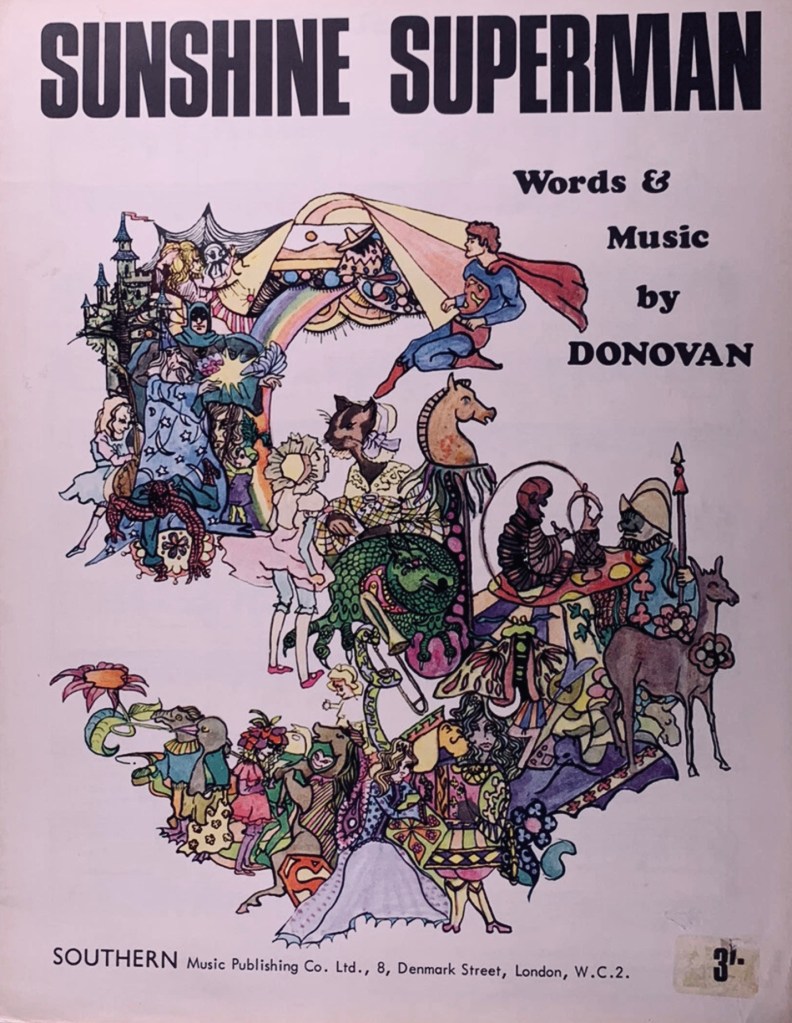 Oddly enough, Donovan’s Sunshine Superman is, despite its wonderful, psychedelically-woozy soundscape, a song about renouncing easy pharmaceutical escapes in favour of patience and resilience. Love, it seems, will arrive in its time for the pure of heart. This being Donovan, mind you, his confidence about his virtues is hardly tainted by modesty. As he sings, “Superman or Green Lantern ain’t got a-nothin’ on me”. Still, for recognising the existence of DC superheroes in (a darn fine) song and for the cover of the British sheet music, above, in which lurks not just Supes, but Batman, Spider-Man & other fantastical icons, I’ve no hesitation in claiming it, rising in August 5th’s 1966’s American singles chart as it was, for The Almanac.